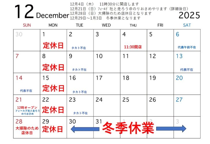 早いもので2025年も最後のひと月となりました。12月4日(木)11:30開店です12月21日(日)フィールド社と走ろう@のりおさ...