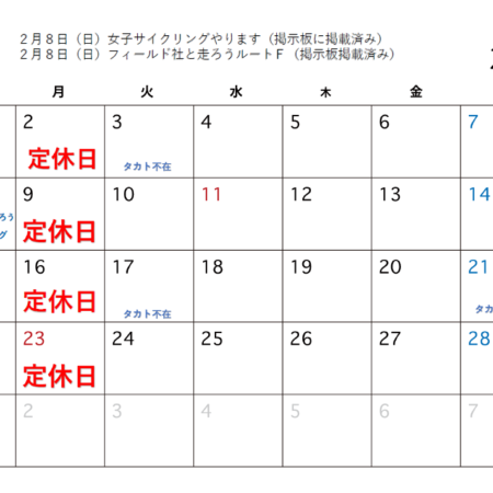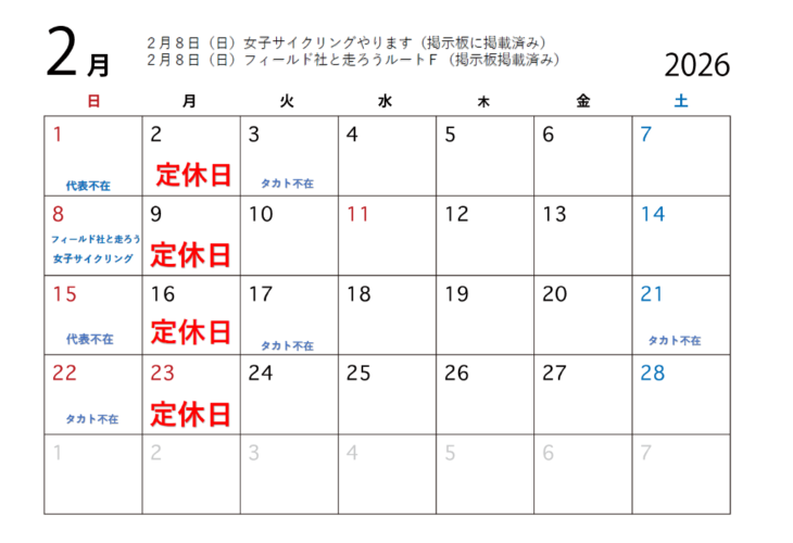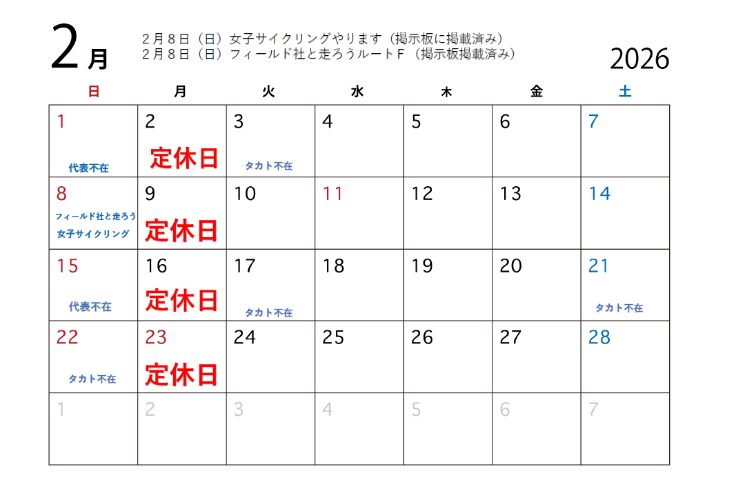 2026年2月の営業案内をさせていただきます 2月8日(日)ライド企画二つあります!! ①2026春の訪れを感じる女子サイクリング...
