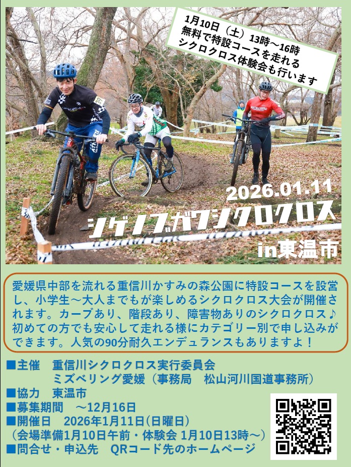 2026年1月11日は第5回重信川シクロクロスin東温市の開催日だ。さすがシゲクロぽかぽか陽気が続いているのに、この日だけ寒波到来予報だ。雨マークは消えつつあるが雪マークがチラツキはじめた…過去に何度も雨男疑いをかけられている私が主催しているのだから荒れた天候からは逃げられないということだろう。参加&運営&観戦する皆さん…考えうる最大の防寒対策でご来場ください(笑)