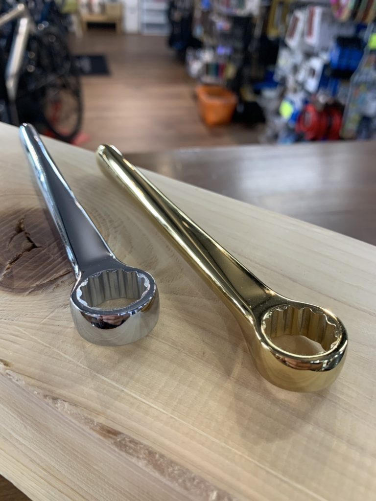 トラックバイクの前後車輪を固定する15mmレンチですが、工具の長さによって製品名が変わります